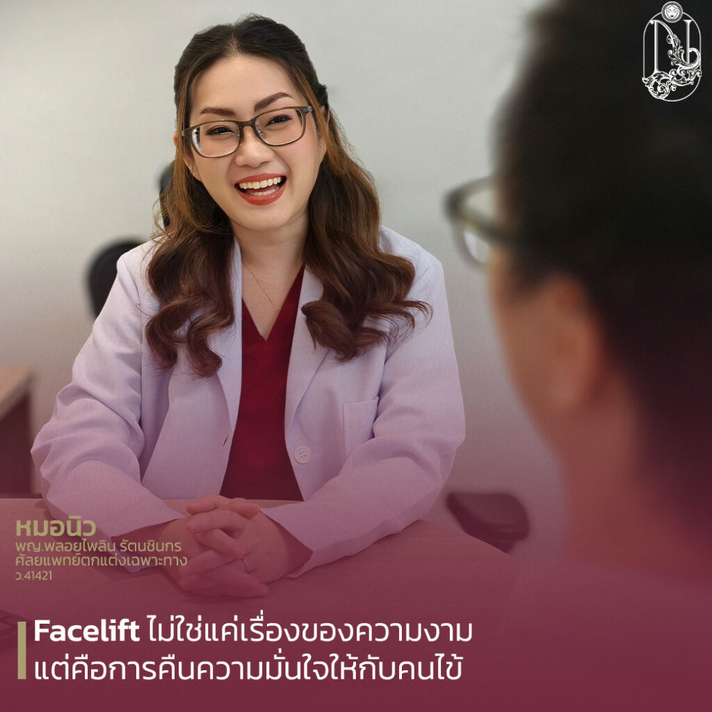 ด้วยเหตุนี้ หมอจึงยิ่งมีความชื่นชอบและมุ่งเน้น “การศัลยกรรมดึงหน้าเฉพาะบุคคล (Persona Facelift)” เพื่อออกแบบการรักษาที่เหมาะกับแต่ละคน เพราะเชื่อว่า การดึงหน้าที่ดี ไม่ใช่การเปลี่ยนคุณเป็นคนใหม่ แต่คือการพาคุณย้อนเวลากลับไปในเวอร์ชันที่ดีที่สุดของตัวเอง